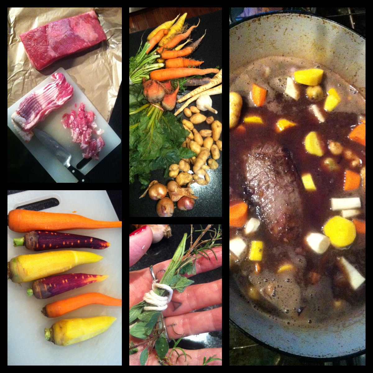 Sweety and I went to the Union Square Farmers Market and scored big time. Rainbow carrots, golden beets, fingerling potatoes, parsnips, shallots, and a beautiful piece of brisket. (The herbs live in my kitchen)